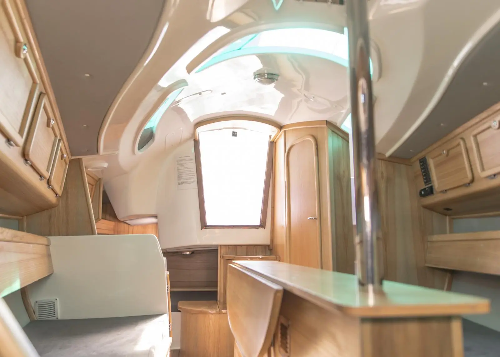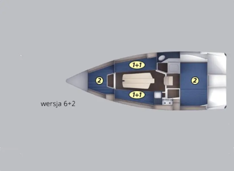 • Kompletne wyposażenie kambuza: 2 garnki, patelnia, durszlak, chochelka, sztućce, nóż do chleba, kubki, talerze, deska do krojenia, miski